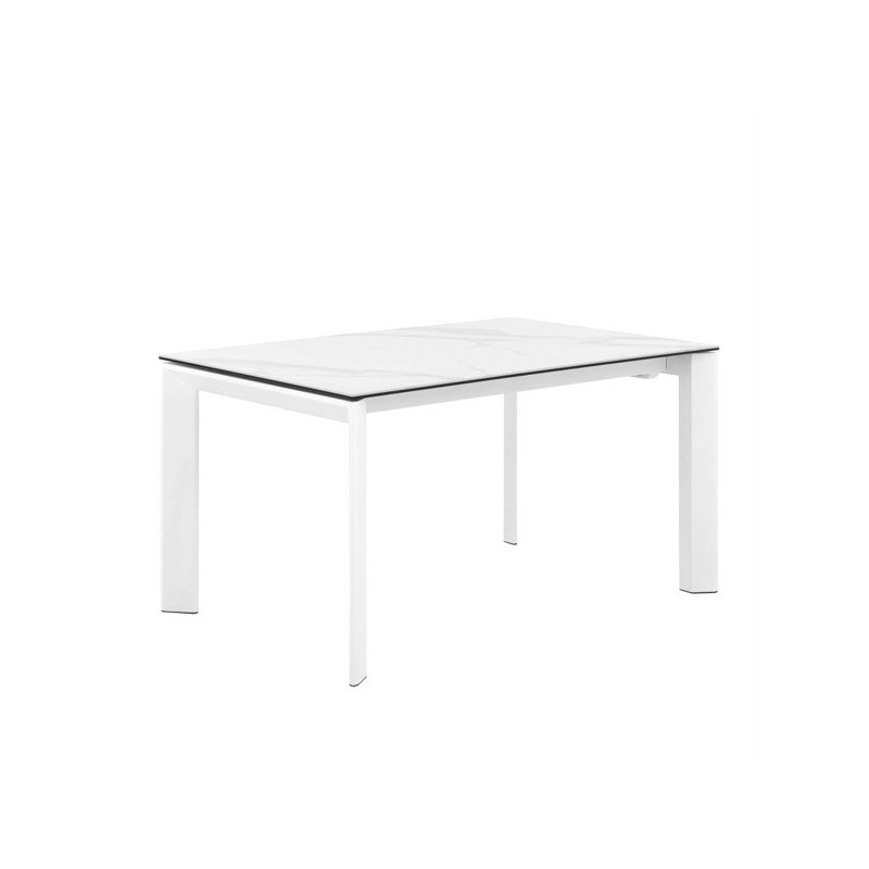 Descubre nuestra mesa extensible PORCELÁNICO EXTENSIBLES, modelo LISA 140 en elegante color blanco. Con un diseño moderno y funcional, esta mesa extensible de acero cuenta con una tapa de porcelánico mármol creta de 5mm de grosor y cristal templado de 8mm. Las patas de DM lacado a color complementan su estilo único.
