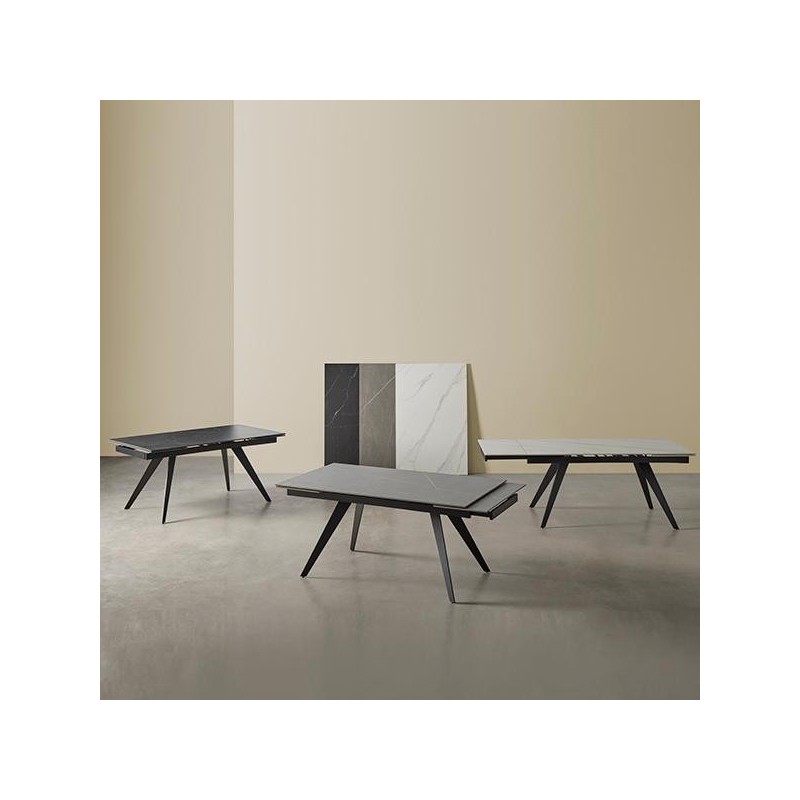 Mesa extensible KELLY en porcelánico blanco y metal negro. Versátil, resistente y elegante. Medidas: 160x90 cm / 180x90, extensible a 200-240 cm / 220-260 cm. Ideal para reuniones y eventos en casa.