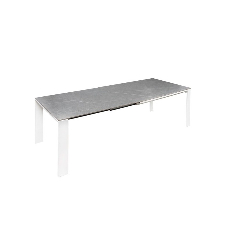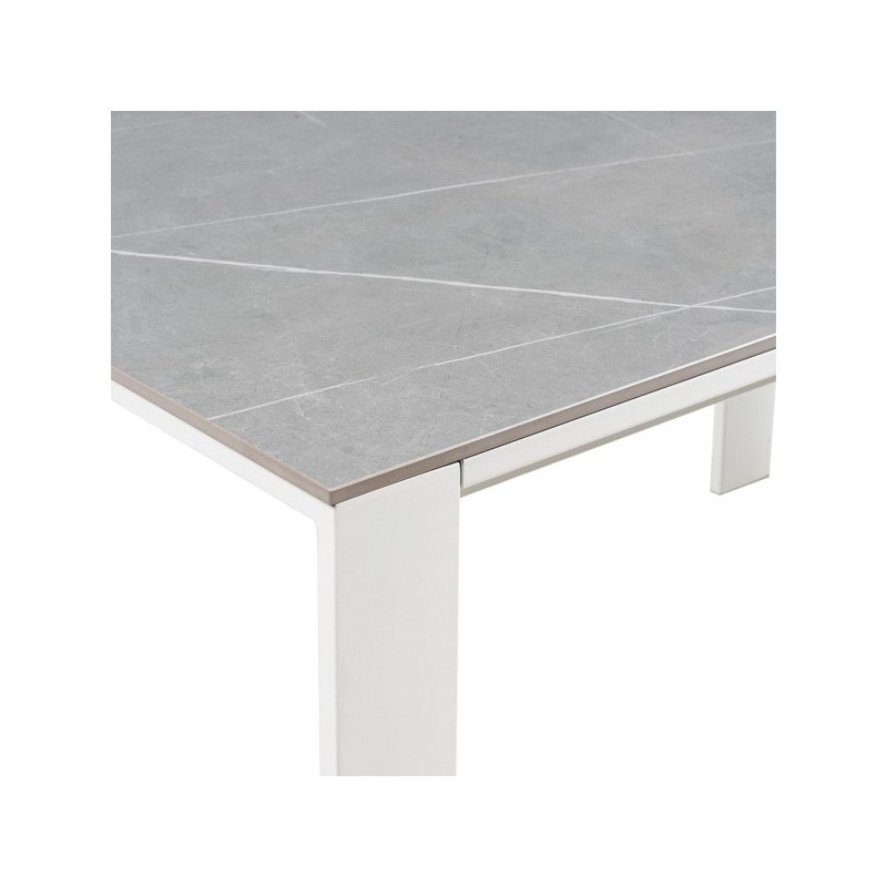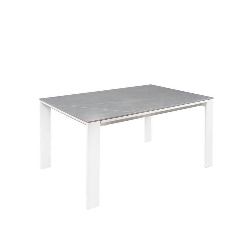 Descubre la elegancia y funcionalidad de la mesa extensible JANET 140 gris/blanco, un mueble de diseño moderno que destaca por su tapa de porcelánico macizo de 10mm en color gris y sus patas de metal blanco. Esta mesa extensible porcelánica es la solución perfecta para espacios reducidos que requieren versatilidad y estilo.
