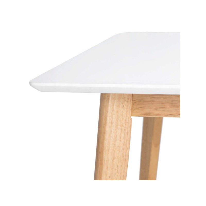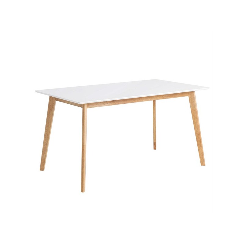Descubre la mesa fija MARIE 140 blanco/roble, un mueble de madera que combina elegancia y funcionalidad. Con una tapa lacada en blanco de 20mm de espesor y patas de hevea, esta mesa rectangular de 140x80cm es perfecta para cocinas y comedores de estilo nórdico.