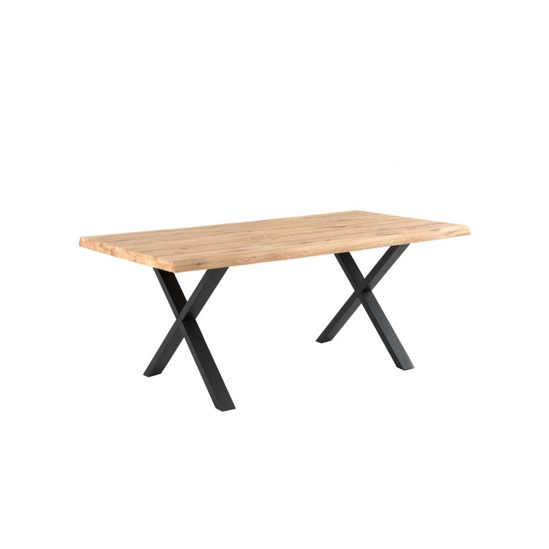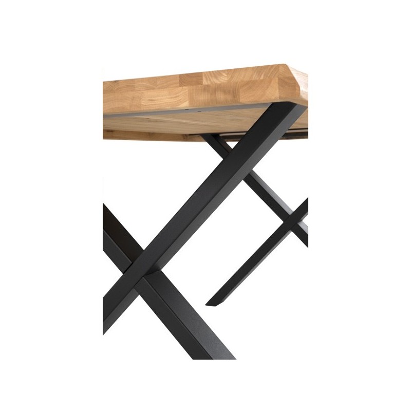 Mesa fija CORINE con diseño moderno y elegante en roble macizo y patas de metal negro en forma de X. Ideal para ambientes industriales.