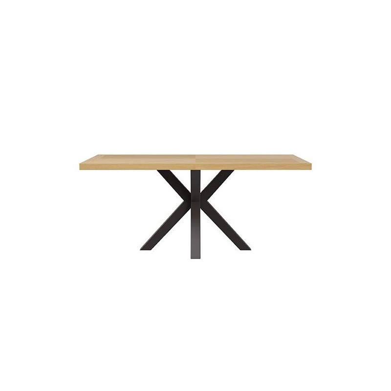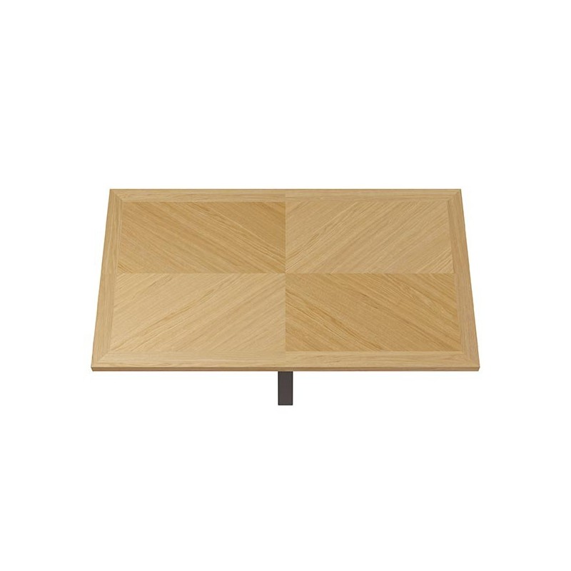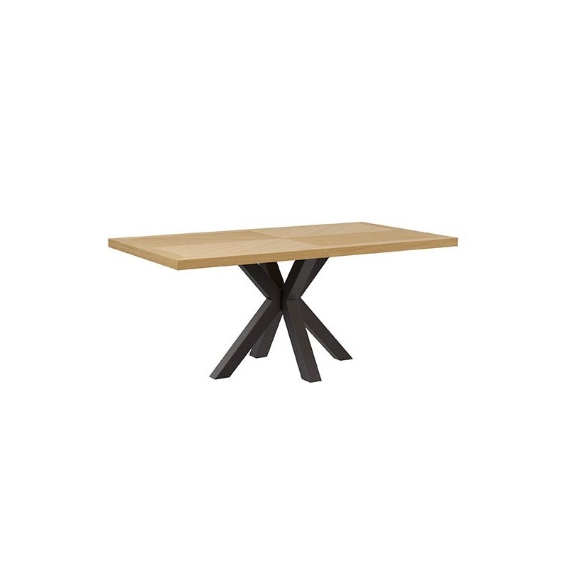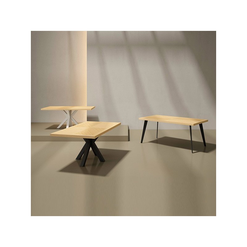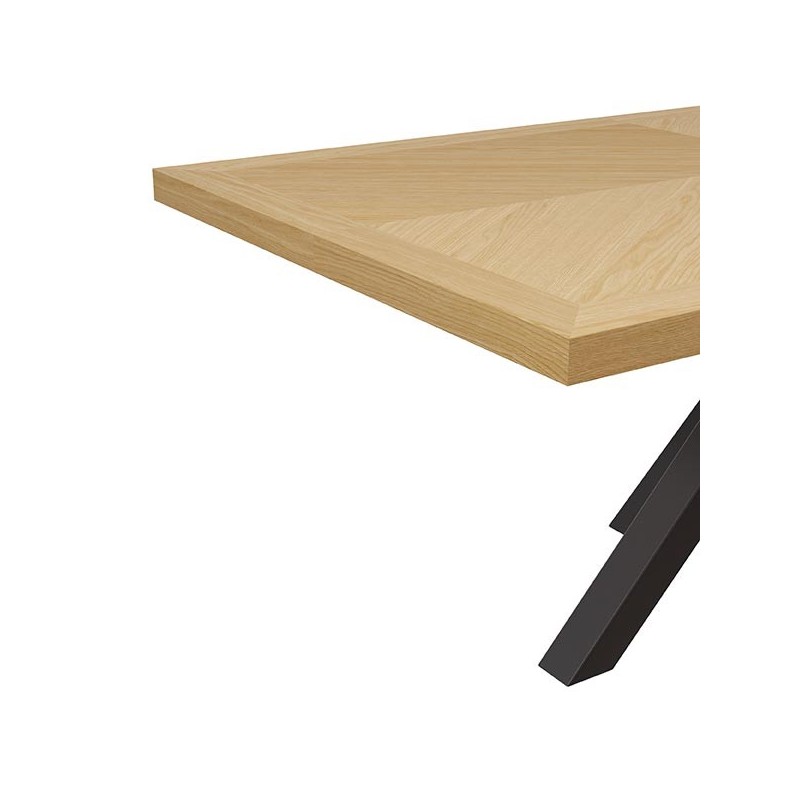 Mesa fija ELAINE en roble y negro, elegante y duradera. Diseño único con chapa de roble y patas de metal. Calidad, estilo y funcionalidad.