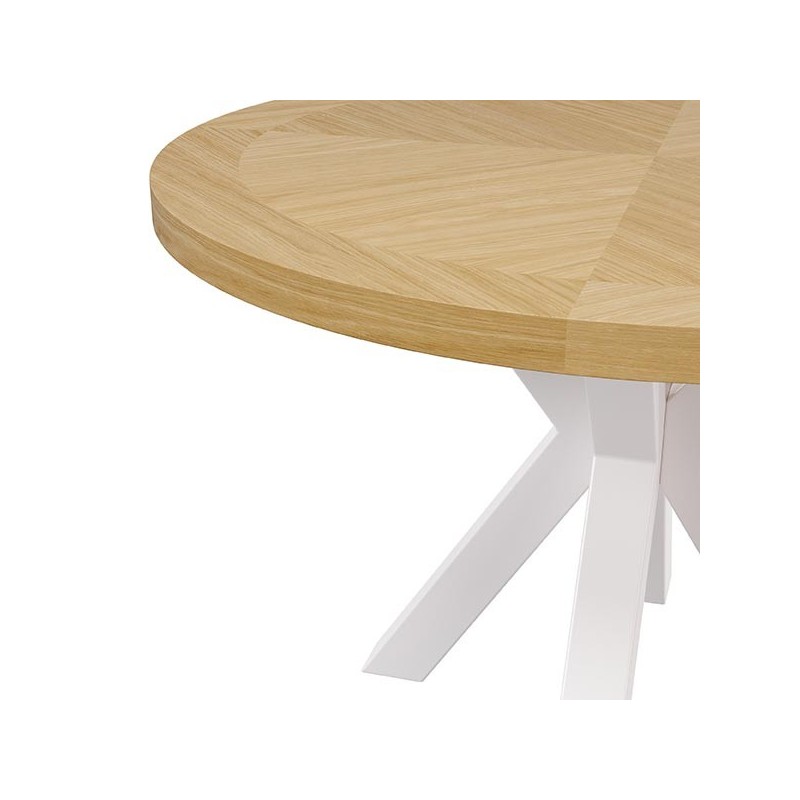 Descubre la mesa fija BEVERLY 100 roble/blanco, un mueble que destaca por su diseño moderno y elegante. La tapa de chapa de roble de 48 mm de grosor se combina armoniosamente con unas patas de metal blanco, creando un aspecto cálido y natural que se adapta a diversos estilos de interiores.