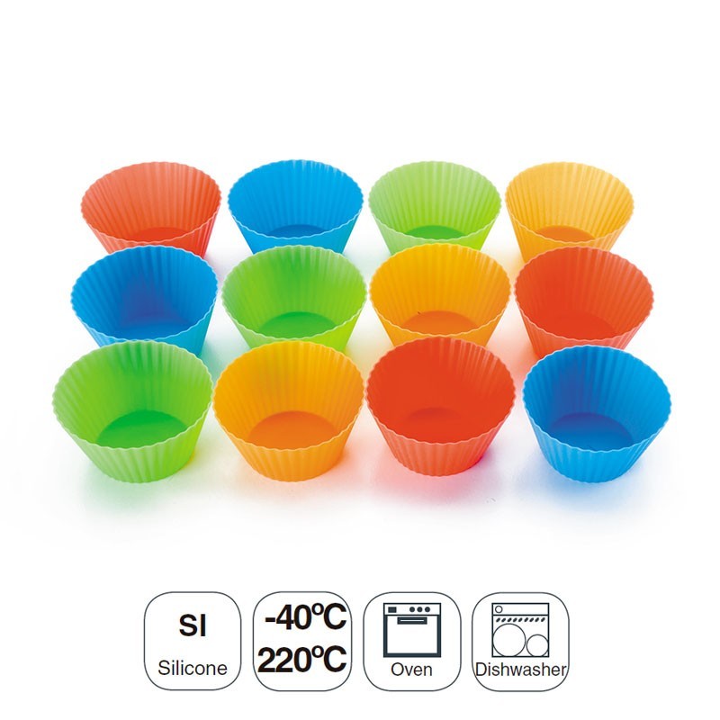 Set compuesto por 12 moldes para Muffin de Ø7x5 cm, y fabricados en silicona de diferentes colores.