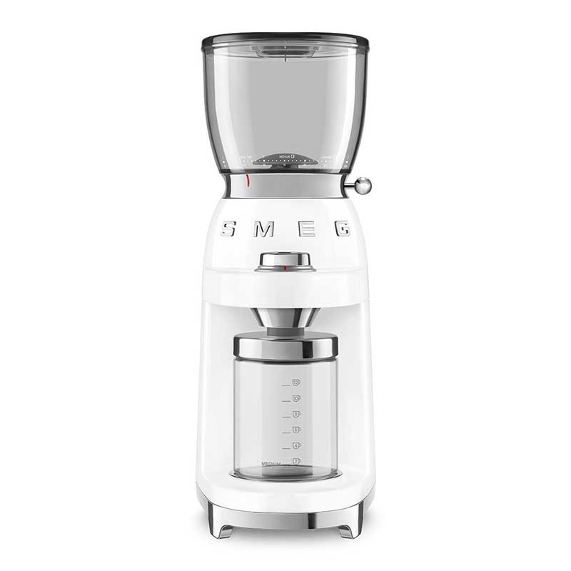 Molinillo eléctrico de café Smeg 50's Style con 30 niveles de molienda de grano diferentes y cuerpo de acero inoxidable acabado blanco brillo.