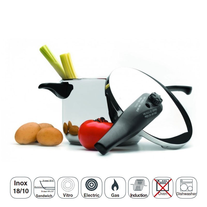 Olla express modelo Tempo fabricada en acero inoxidable 18/10 con fondo termodifusor sándwich apto para cocinas de gas, inducción, vitrocerámicas y eléctricas.