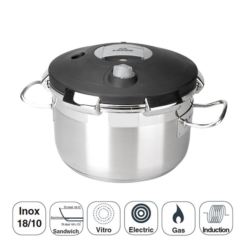 Olla express profesional modelo Chef Luxe fabricada en acero inoxidable 18/10 con fondo termodifusor sándwich apto para placas de inducción, eléctricas, vitrocerámicas y cocinas de gas.