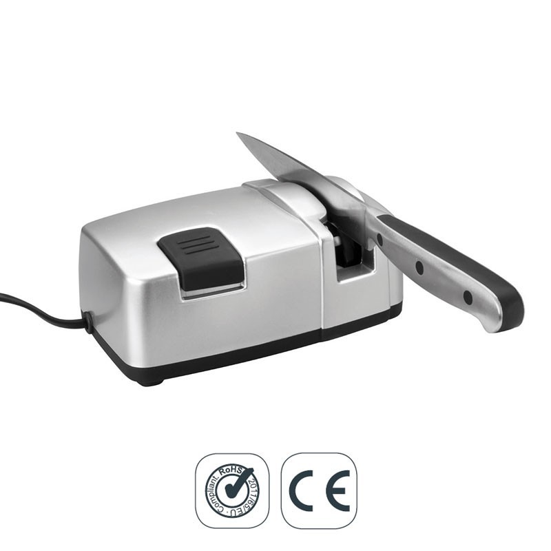 Afilador de cuchillos eléctrico de 60 W de potencia exclusivamente para cuchillos de hoja lisa. Medidas: 16x11x7,5 cm.