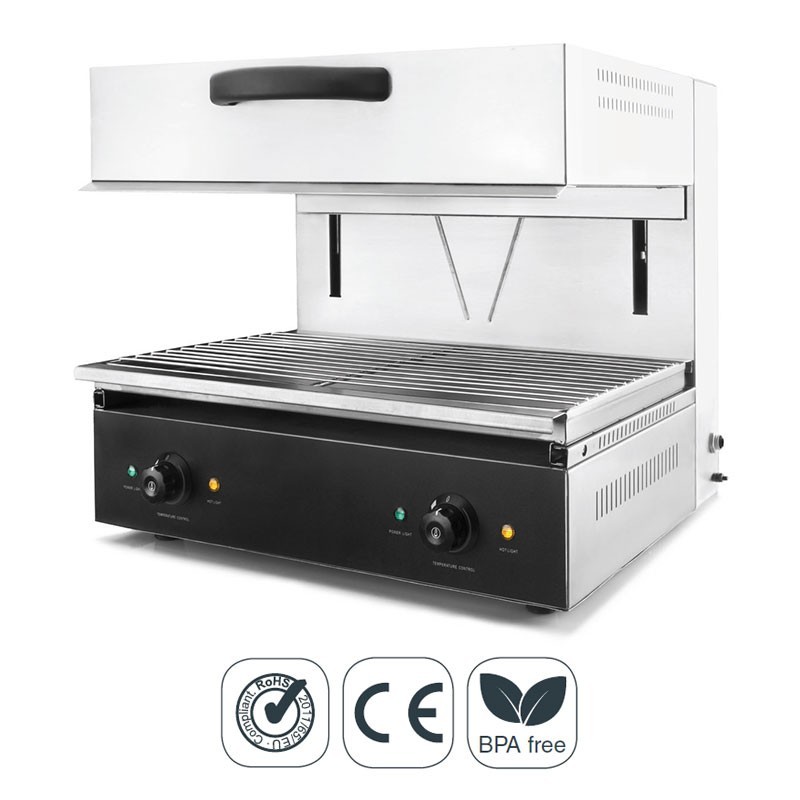 Salamandra eléctrica de 4000 W en acero inoxidable con 2 reguladores de temperatura ideal para calentar alimentos, asar, tostar o gratinar.