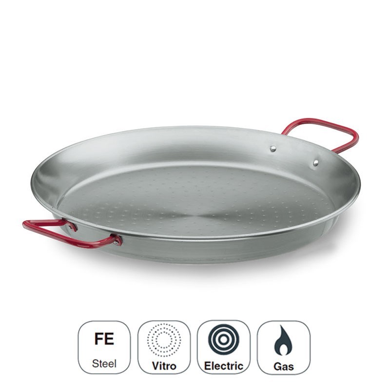 Paellera fabricada en acero de gran calidad y resistencia. Apta para cocinas de gas, vitrocerámicas y eléctricas. Disponible en varios tamaños.