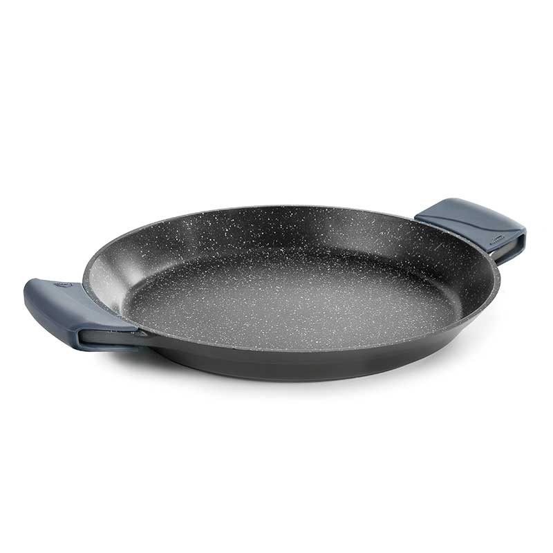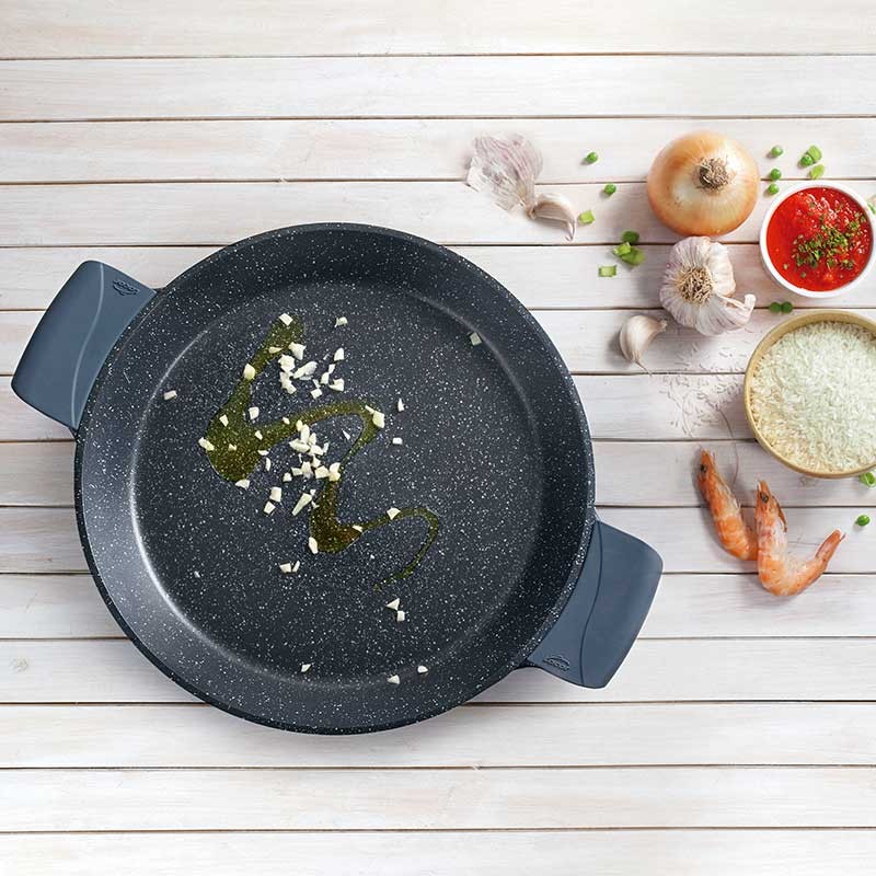 Paellera de aluminio fundido antiadherente de gran calidad y espesor modelo Eco-Piedra. Fondo difusor apto para todo tipo de cocinas.
