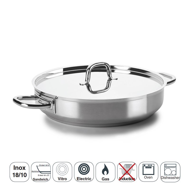 Paellera profesional sin tapa modelo Chef Luxe fabricada en acero inoxidable 18/10 con fondo termodifusor sándwich apto para placas de inducción, eléctricas, vitrocerámicas y cocinas de gas.