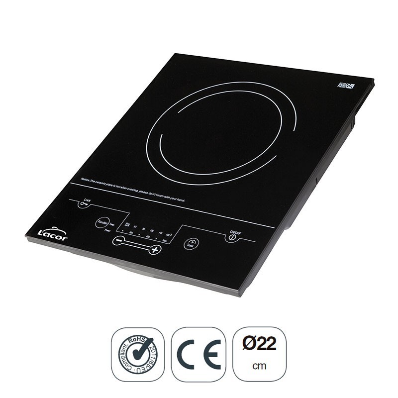 Placa de inducción portátil de 2000 W con 1 zona de cocinado de 22 cm de diámetro, 6 niveles de potencia y temporizador.