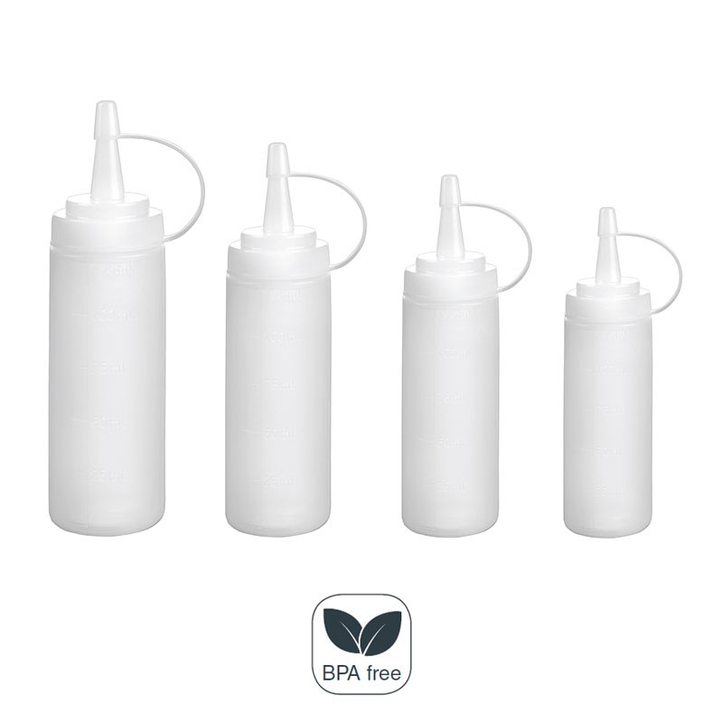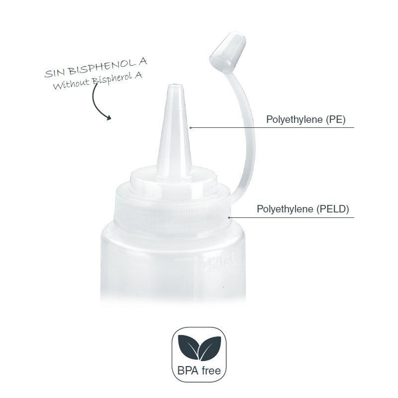 Botella biberón adecuada para almacenar y dosificar de forma sencilla y limpia cualquier tipo de salsa, aceites o vinagres.