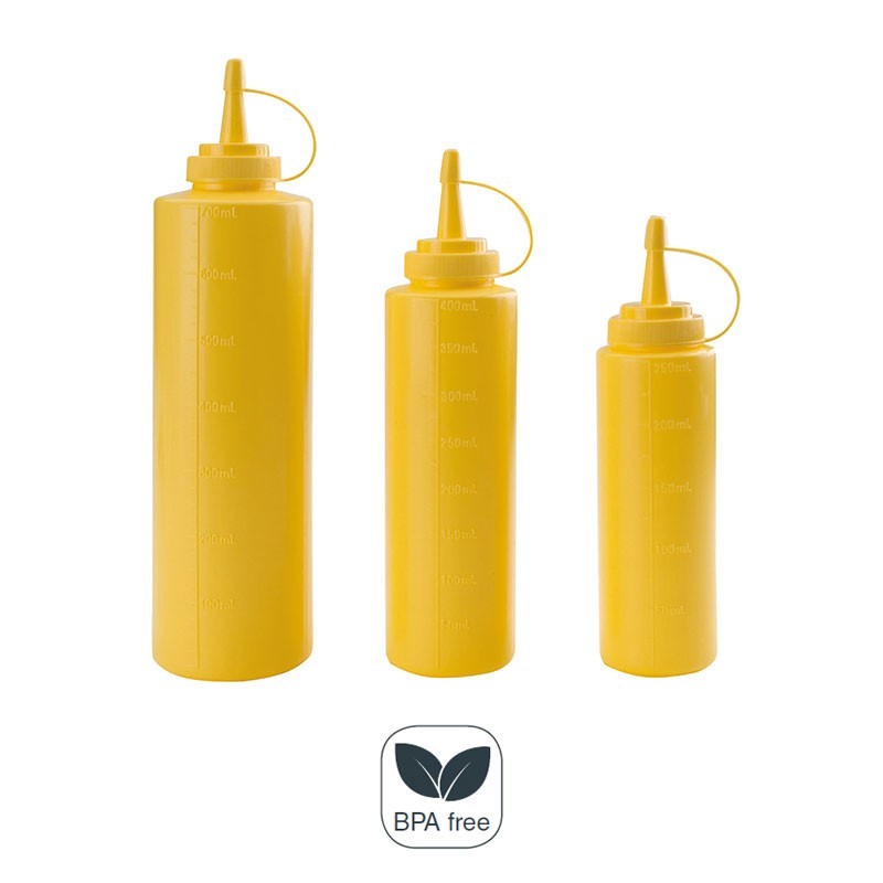 Botella biberón para cocina hecha de polietileno color amarillo apto para alimentación y libre de bisfenol A.