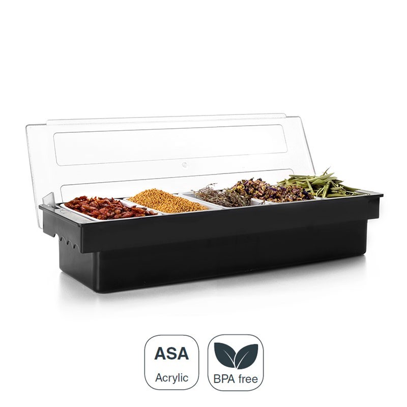Contenedor con tapa y 5 cuencos para condimentos fabricado en acrílico libre de bisfenoles. Ideal para aliños, especias, frutos secos o similares.