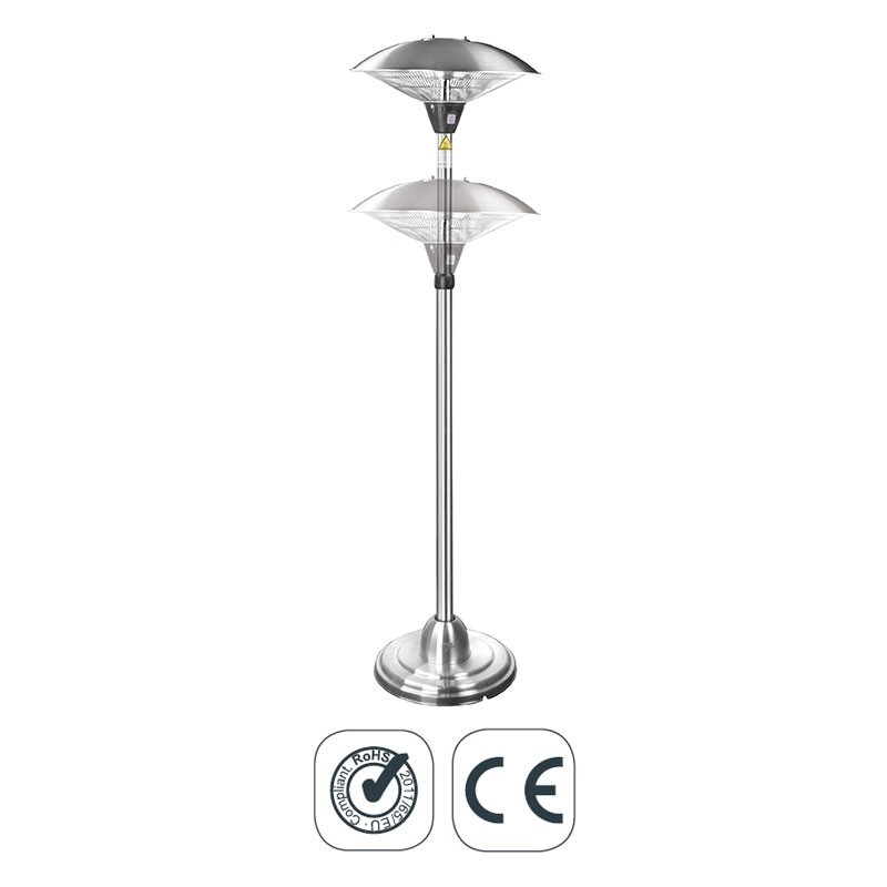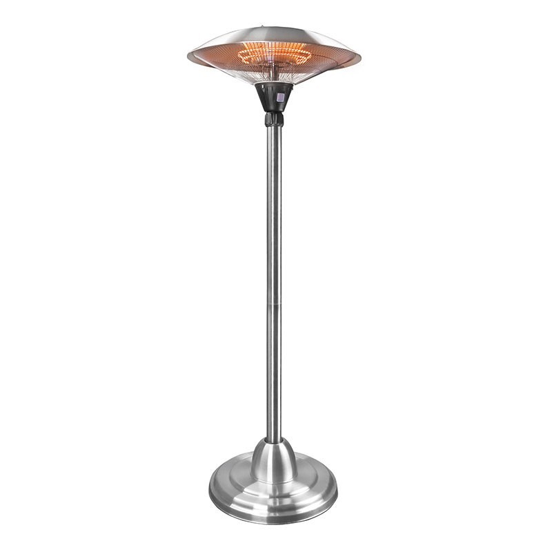 Calefactor eléctrico de pie para terrazas fabricado en acero inoxidable con lámpara halógena infrarroja y una altura total de 210 cm. Disponible en 2 tipos: fijo y regulable en altura.