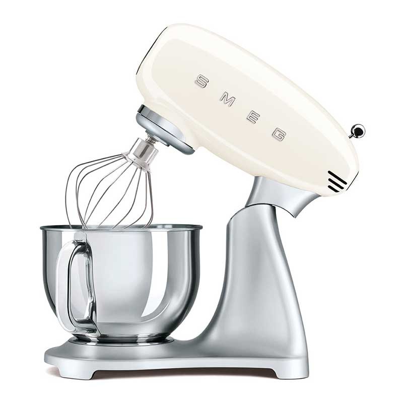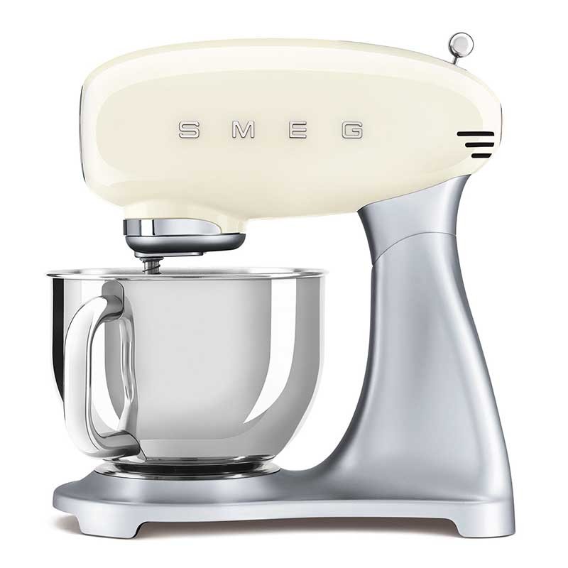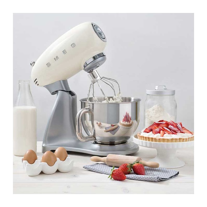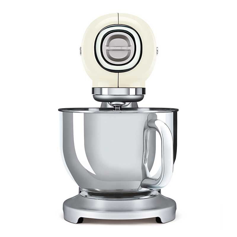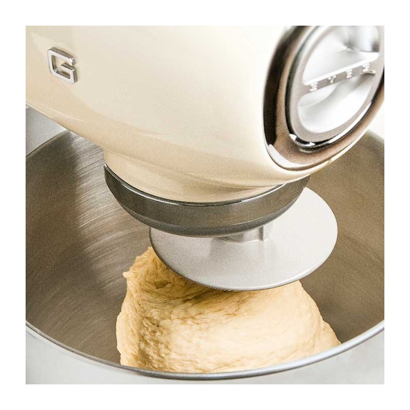 Batidora amasadora Smeg 50's Style con cuerpo en aluminio fundido, cubierta superior en acabado crema brillo, 800 W de potencia y 10 velocidades.
