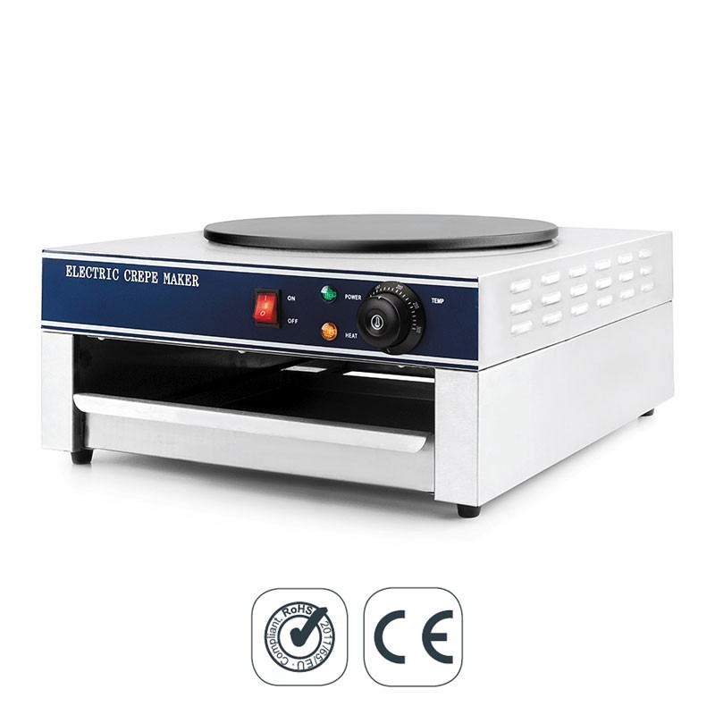 Crepera eléctrica profesional de 3000 W con regulador de temperatura de 50 a 250ºC y zona de plancha antiadherente de 35 cm de diámetro.
