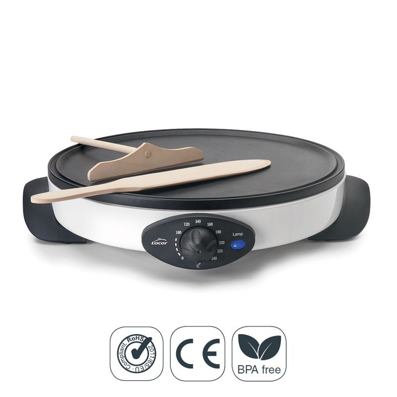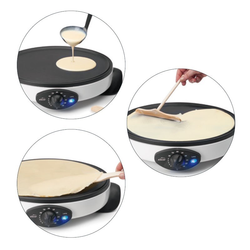 Crepera eléctrica White de 1000 W con regulador de temperatura hasta 240ºC y superficie antiadherente de 30 cm. Incluye accesorios de madera.