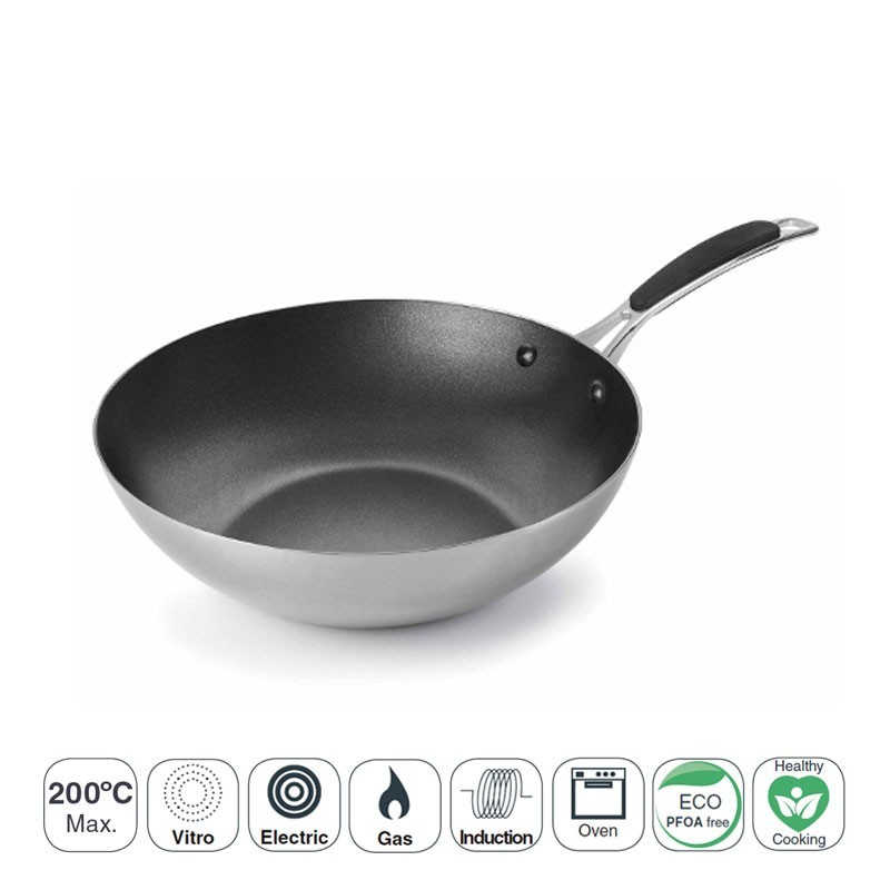 Wok con recubrimiento antiadherente modelo Trimetal fabricado con 3 capas (2 de acero inoxidable y 1 de aluminio) de primera calidad apto para todo tipo de cocinas.