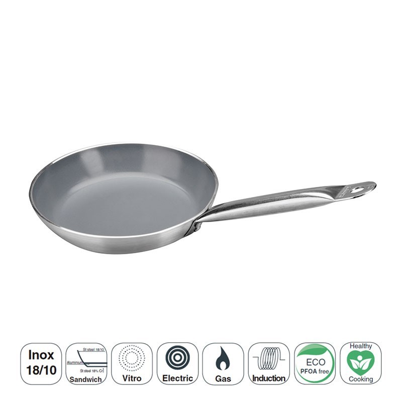 Sartén Eco-Chef con fondo antiadherente fabricada en acero inoxidable de gran calidad apto para cocinas de gas, vitrocerámicas y eléctricas.