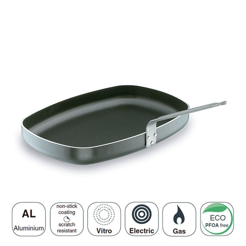 Sartén rectangular modelo Robust fabricada en aluminio de gran espesor que proporciona un calentamiento rápido y uniforme durante el cocinado.