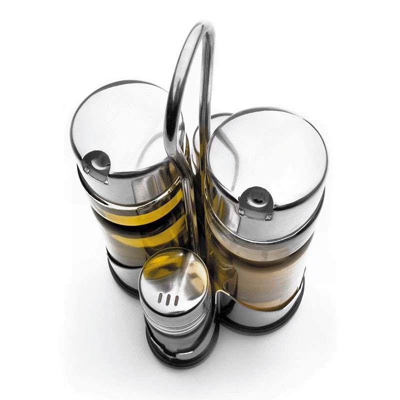 Juego vinagrera y aceitera de 175 ml cada uno, mas salero y pimentero de 37,5 ml cada uno, fabricado en acero inoxidable y cristal.