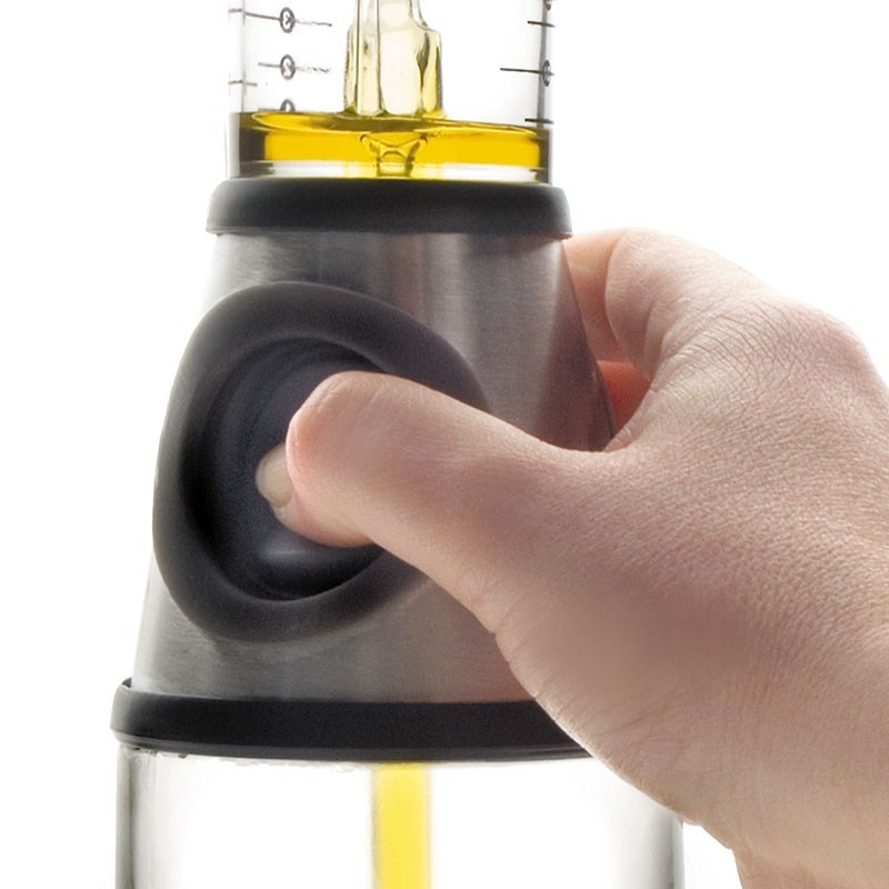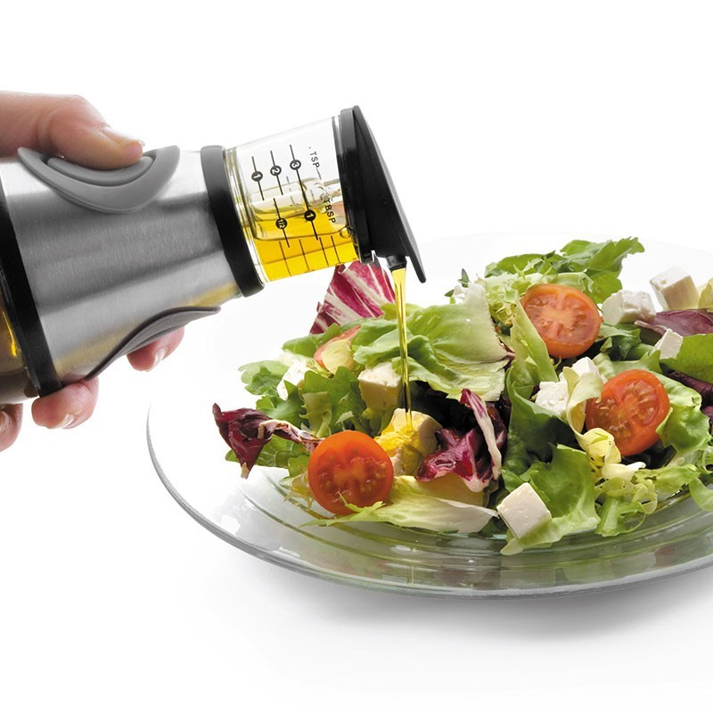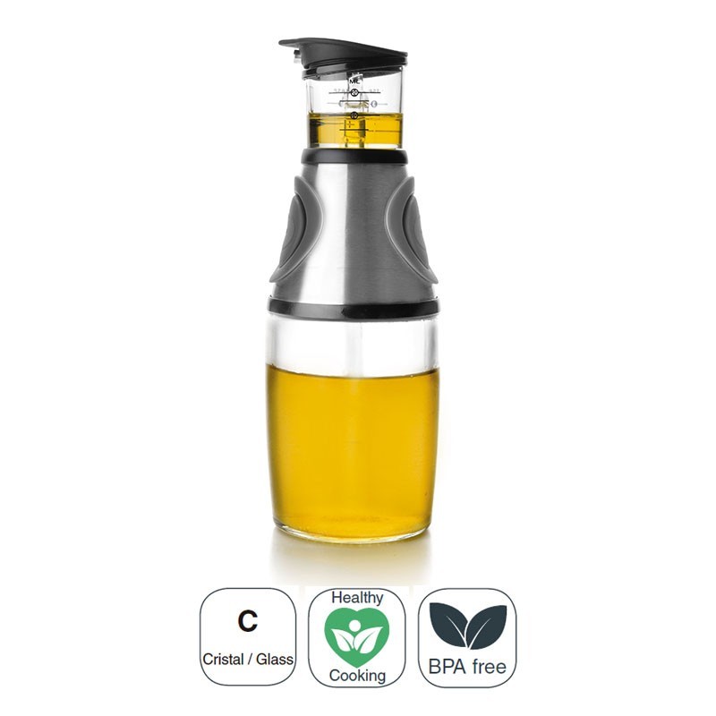 Dosificador de aceite con medidor fabricado en cristal y acero inoxidable. Al pulsar el botón el aceite sube hasta el medidor y ya está listo para dosificar la cantidad deseada. Medidas: 7,8x23 cm Capacidad: 250 ml.