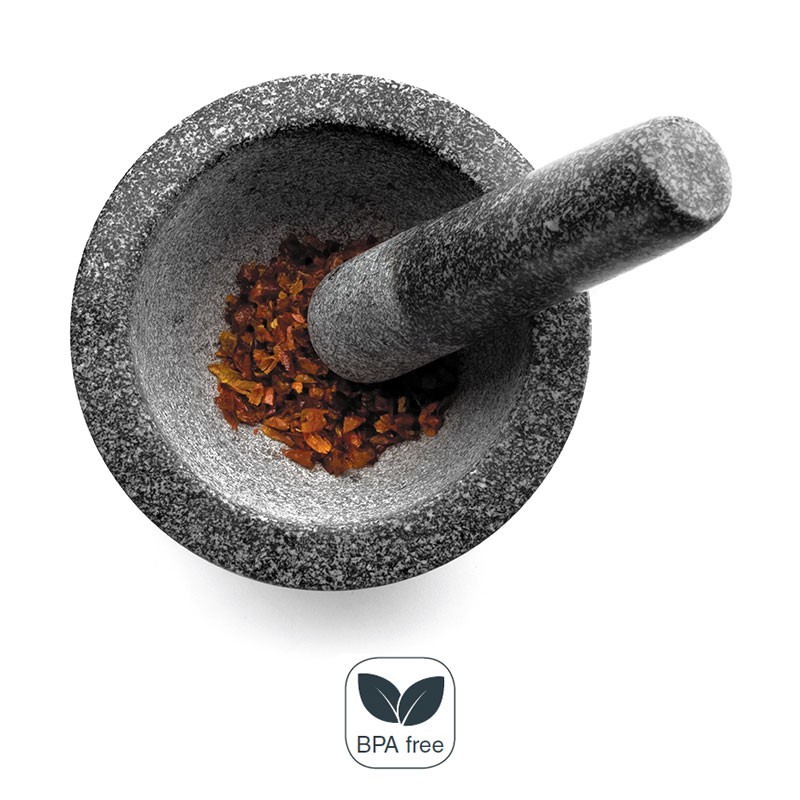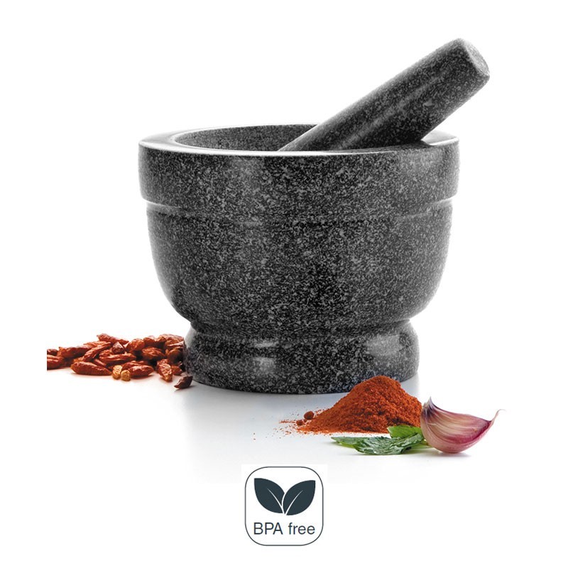 Mortero con mano fabricado en granito de gran calidad color negro con interior no poroso. Disponible en varias medidas.