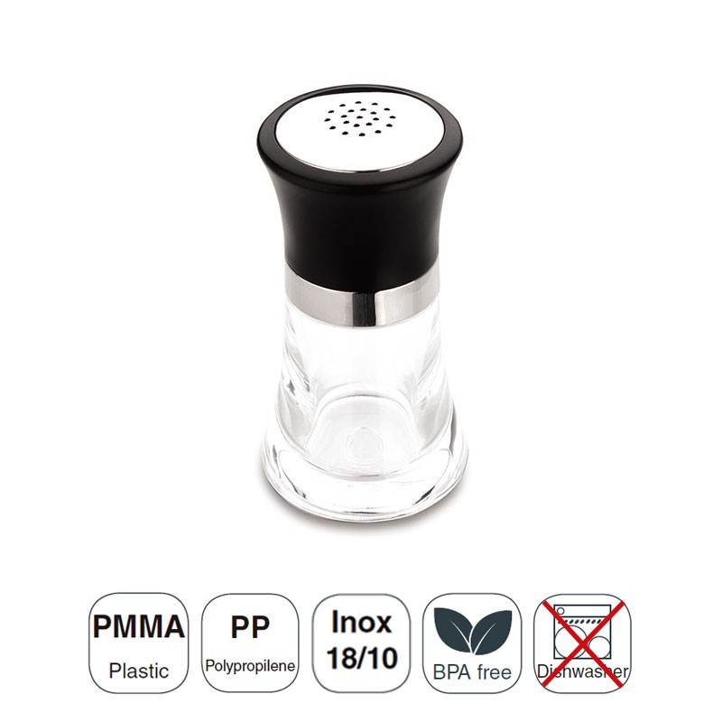 Salero de plástico libre de bisfenoles de 7 cm de diámetro y 12,5 cm de alto, con tapa de polipropileno y acero inoxidable 18/10.