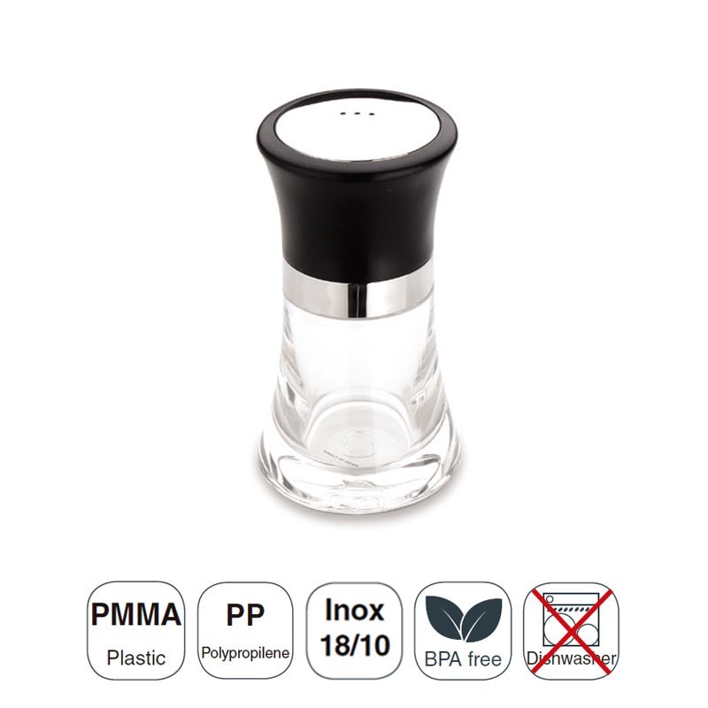 Pimentero de plástico libre de bisfenoles de 7 cm de diámetro y 12,5 cm de alto, con tapa de polipropileno y acero inoxidable 18/10.