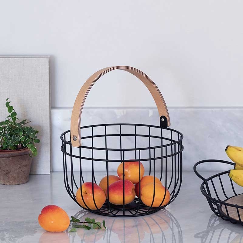 Frutero redondo fabricado en alambre de acero resistente y duradero con un acabado negro mate y un diseño original y decorativo.