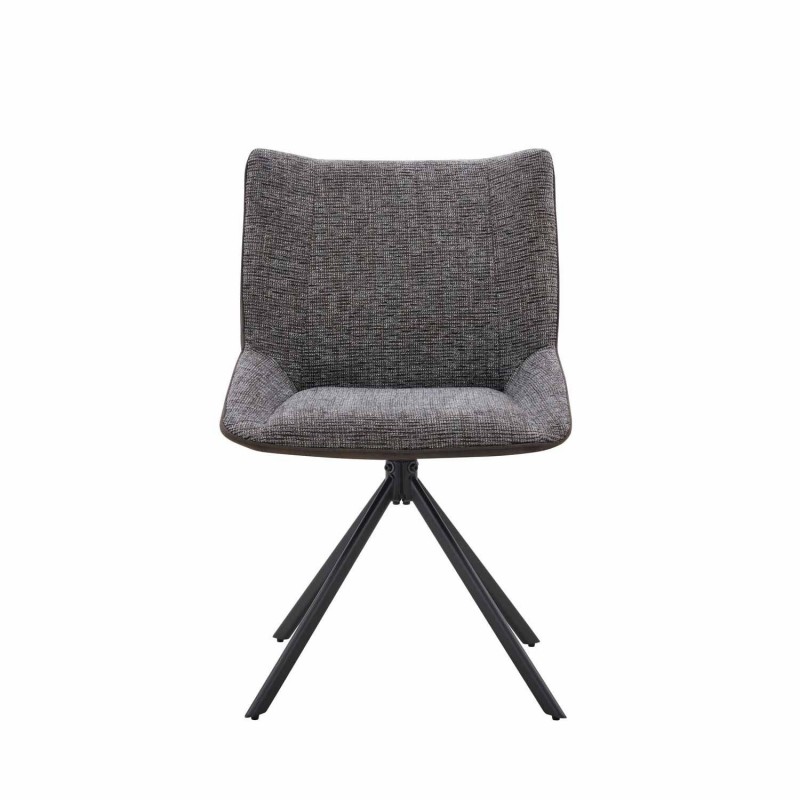 La silla ALESSIA combina su asiento y respaldo tapizados en un tejido texturizado gris oscuro con una capa exterior que simula antelina, proporcionando una textura suave y agradable al tacto.