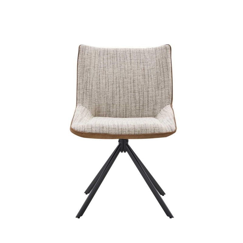 La silla ALESSIA combina su asiento y respaldo tapizados en un tejido texturizado taupe con una capa exterior que simula antelina, proporcionando una textura suave y agradable al tacto.