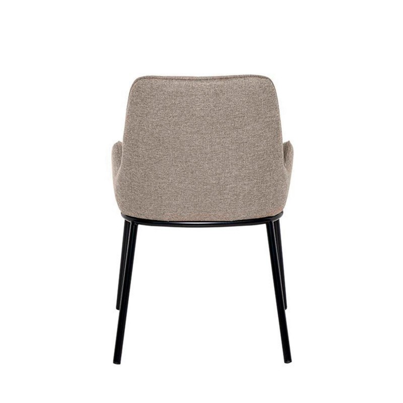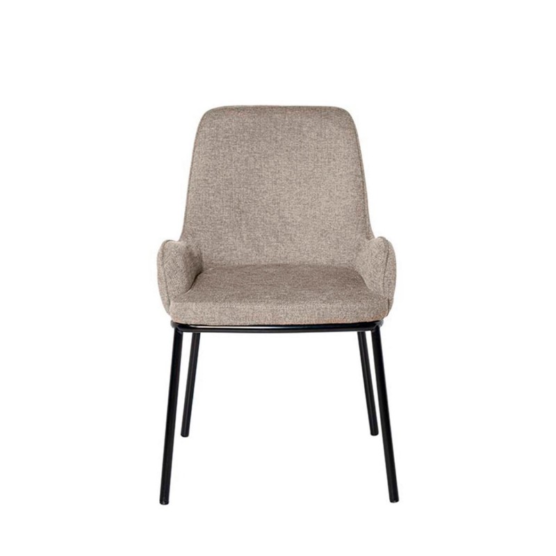 Silla LARISA: diseño innovador con respaldo y reposabrazos integrados. Tejido taupe acolchado y detalles metálicos negros. Confort y estilo moderno.
