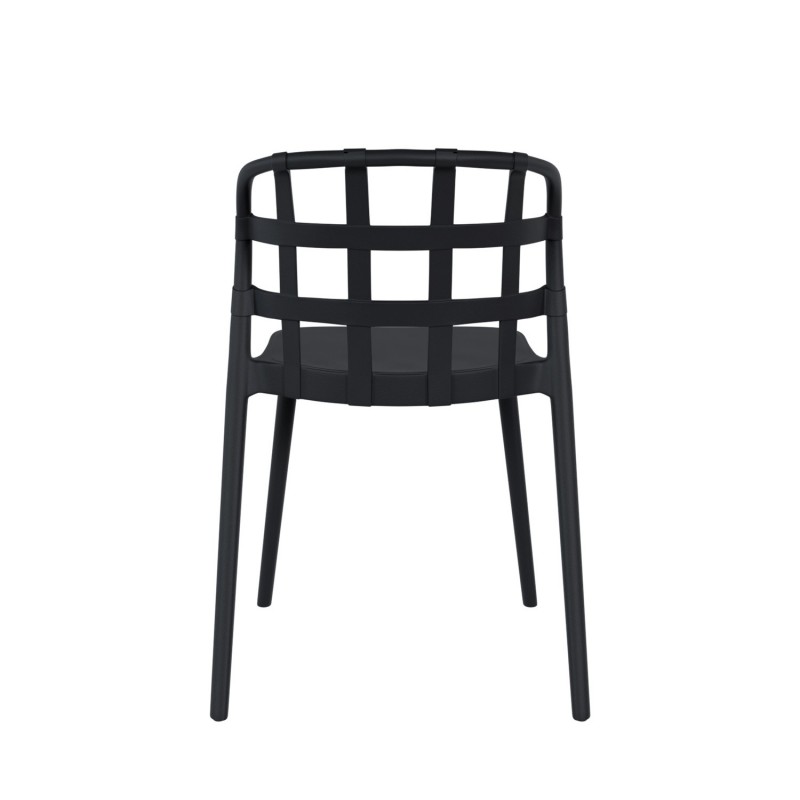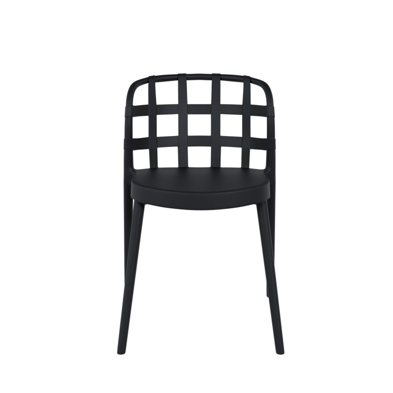 El asiento, de grosor generoso, ofrece mayor comodidad y estabilidad, mientras que el respaldo, ligeramente curvado, está diseñado para adaptarse ergonómicamente a la forma de la espalda, brindando una experiencia de asiento más cómoda y relajada. Este último, además, destaca por su distintivo patrón de rejilla de tiras anchas entrecruzadas, aportando un toque moderno y sofisticado. Fabricada completamente en polipropileno de alta calidad, esta silla no solo es duradera, sino que también es apilable, lo que facilita su almacenamiento y transporte.