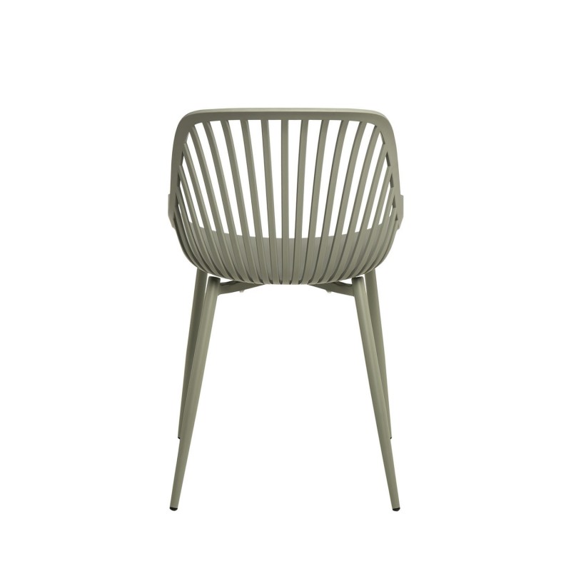 El respaldo, compuesto por barras delgadas, añade un toque distintivo y moderno, mientras que las estilizadas patas de metal refuerzan su aspecto sofisticado, haciendo de esta silla una elección ideal para cualquier espacio contemporáneo.