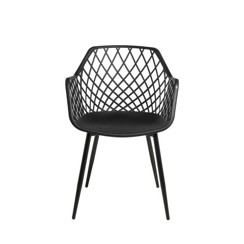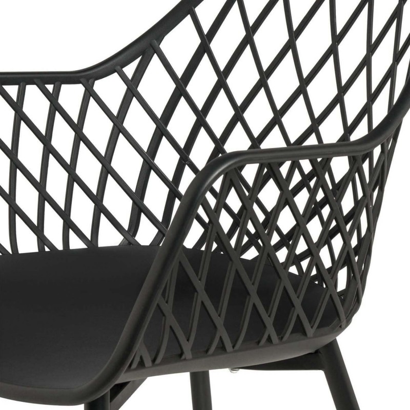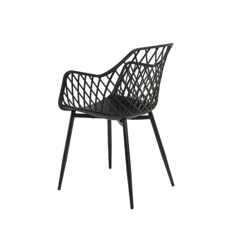 Su respaldo y brazos entrelazados en forma de rejilla crean un patrón geométrico que añade un toque distintivo a cualquier espacio. Fabricada con polipropileno resistente y patas de metal lacado, esta silla es ideal para aquellos que buscan una pieza atemporal y versátil.