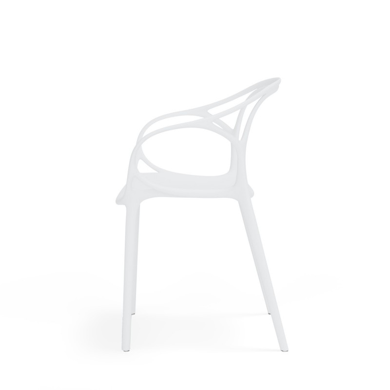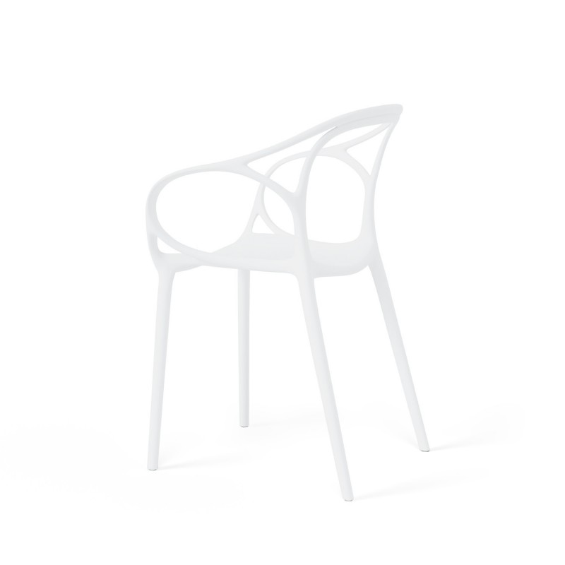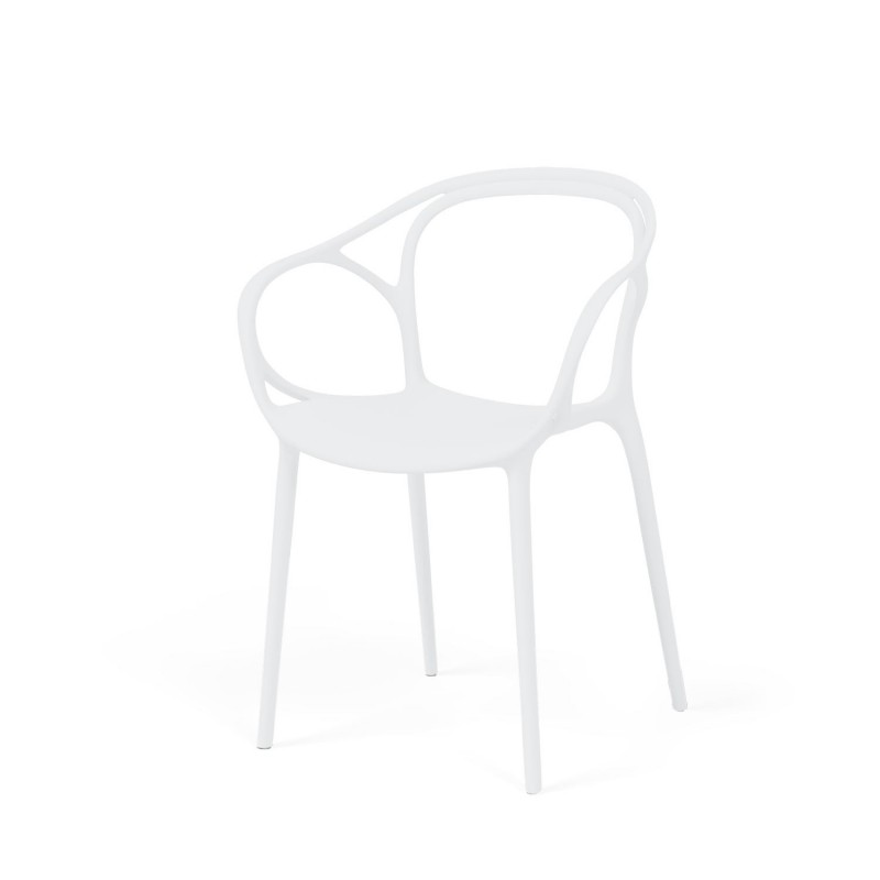 La silla EILIN en color blanco está fabricada en polipropileno, lo que la hace resistente y fácil de limpiar. Su diseño minimalista y elegante la convierte en una pieza versátil que se adapta a cualquier estilo de decoración.