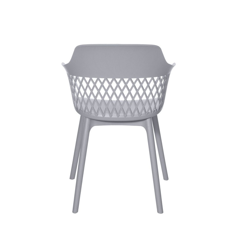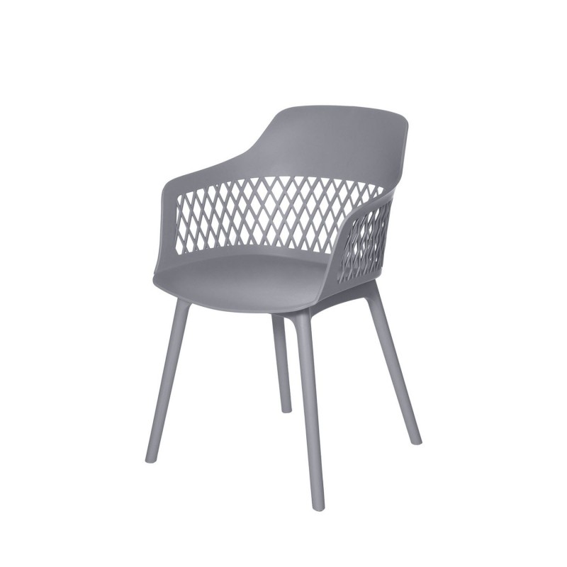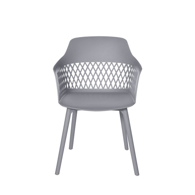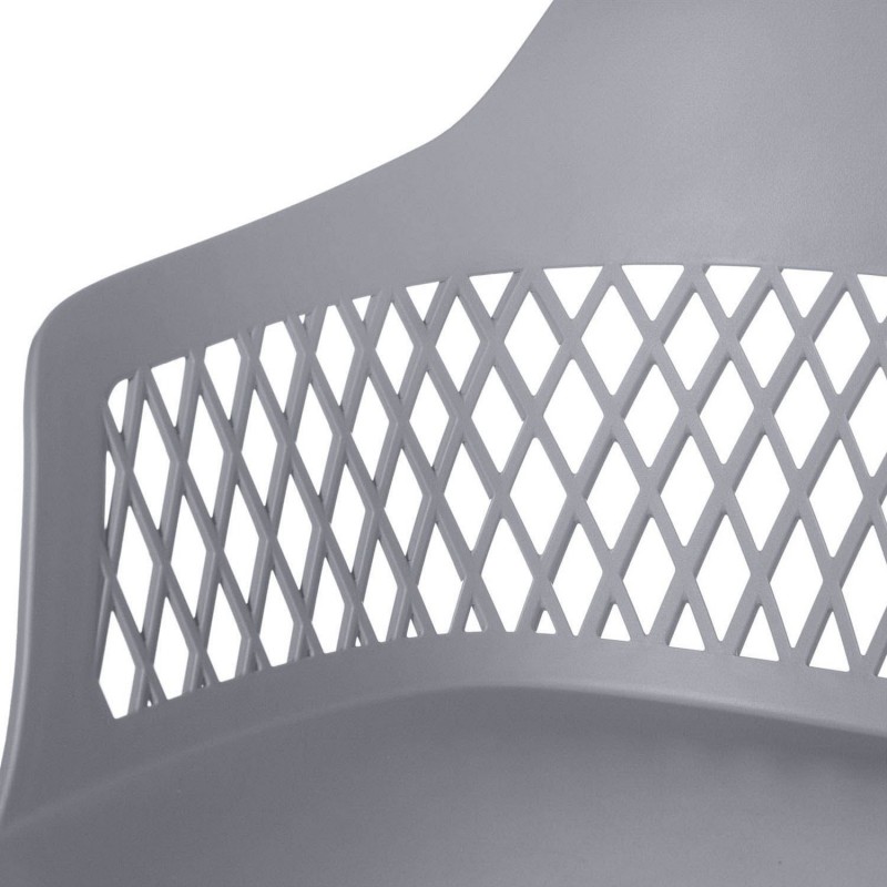 Silla JAYDEN en gris con respaldo enrejado y diseño curvado para soporte óptimo. Fabricada en polipropileno para durabilidad y fácil limpieza. Atemporal y versátil.