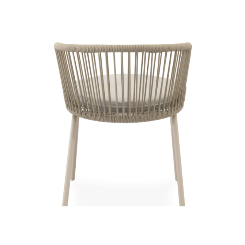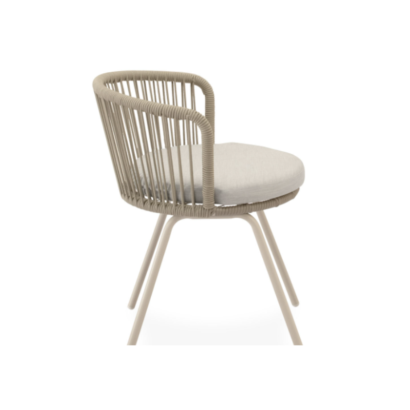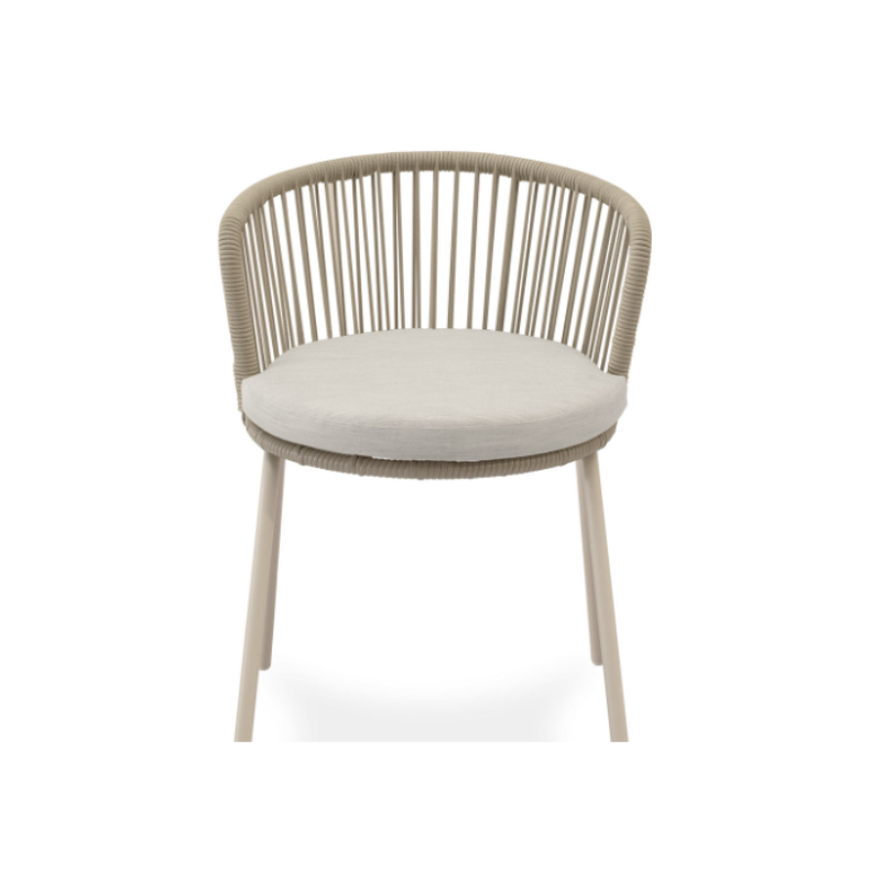 La silla VILMA para ambientes exteriores cuenta con un asiento y respaldo tejido en resistente cuerda, destacando sus líneas suaves y envolventes, además de su color beige.