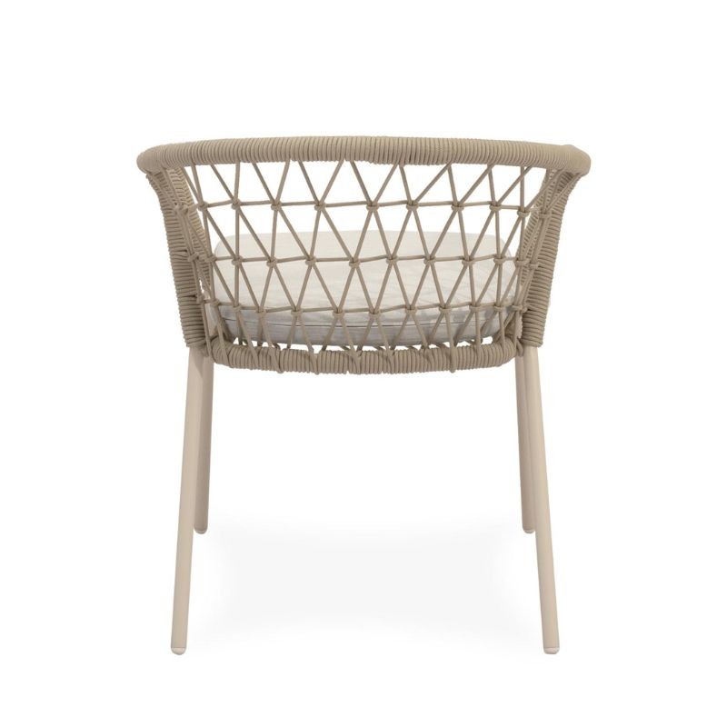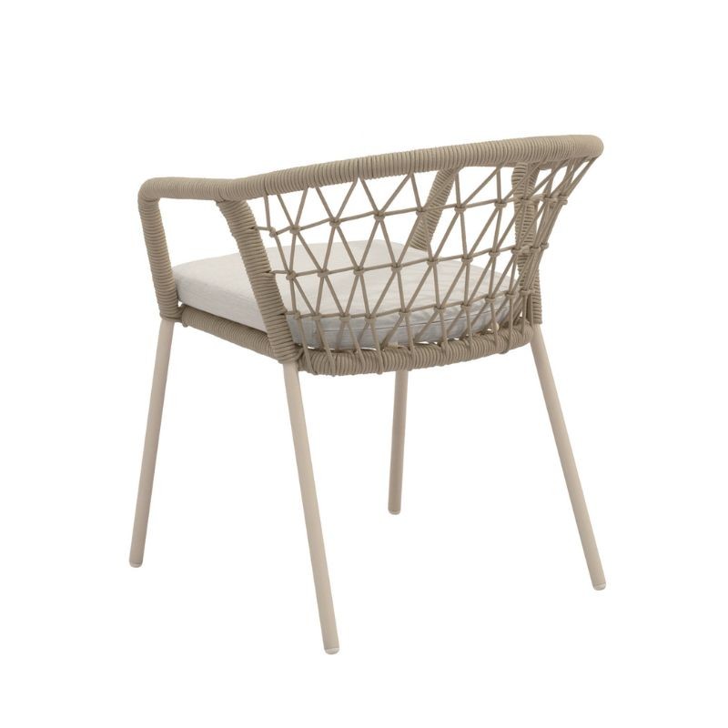 La estructura de la silla SOLENE está compuesta por un entramado de cuerda resistente que envuelve suavemente el respaldo y los reposabrazos, creando un efecto visual atractivo y aportando un soporte ergonómico. Disponible en tonos naturales, permite integrarse en terrazas, jardines o patios, aportando un toque contemporáneo y acogedor.