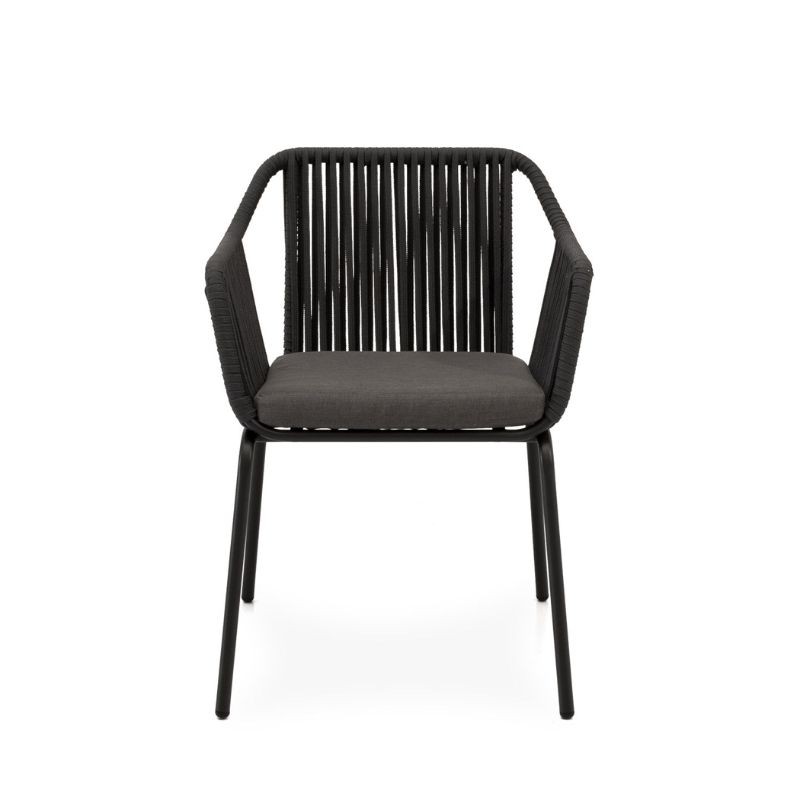 La silla de exterior PENNY gris tiene un respaldo y reposabrazos con una estructura compuesta por líneas verticales de cuerda y además patas de acero especialmente tratado para resistir a la intemperie.