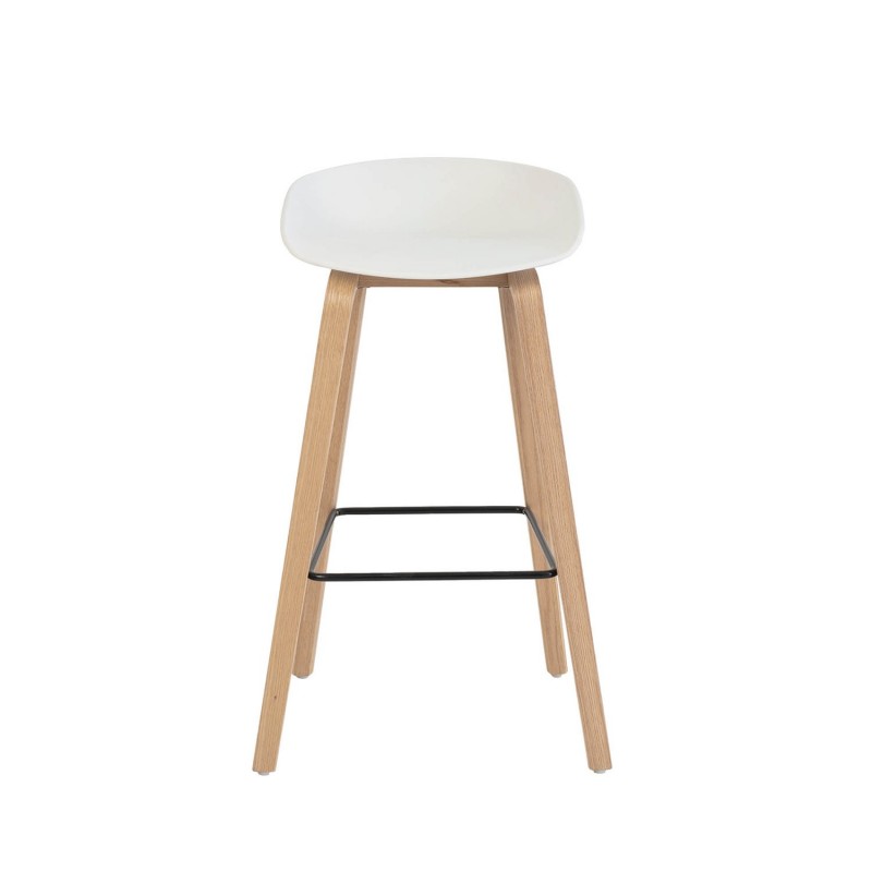 El taburete alto RONIE destaca por su elegante estructura de patas de madera y su asiento de polipropileno blanco, diseñado ergonómicamente para ofrecer la máxima comodidad.