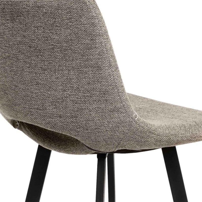 Su estructura está compuesta por patas de metal y un tapizado de tela en color taupe (100% poliéster), con una ligera curvatura en el respaldo que proporciona mayor comodidad.