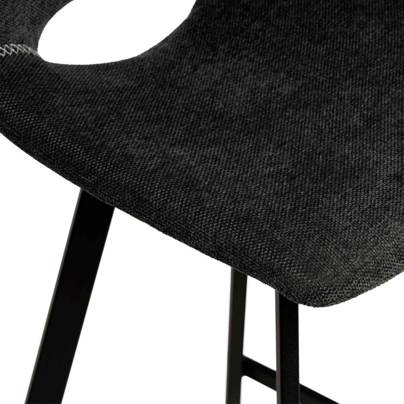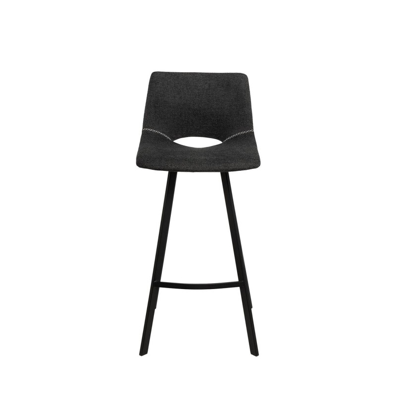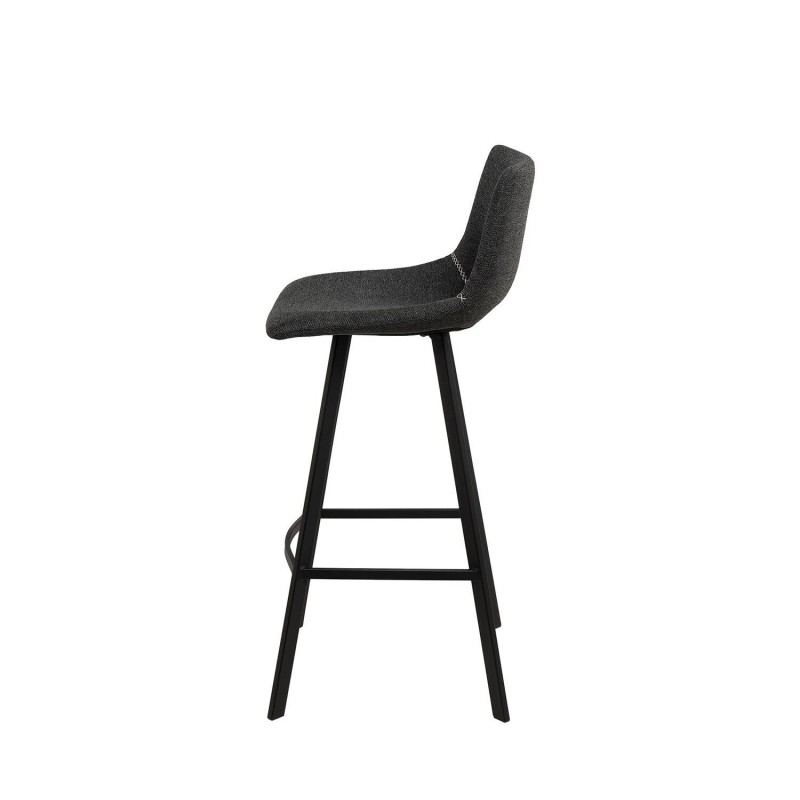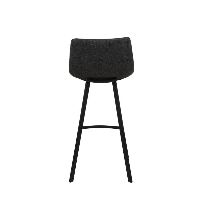 Taburete alto ASTON gris oscuro, ideal para interiores contemporáneos. Estructura de metal, tapizado de tela gris oscuro y reposapiés circular integrado.