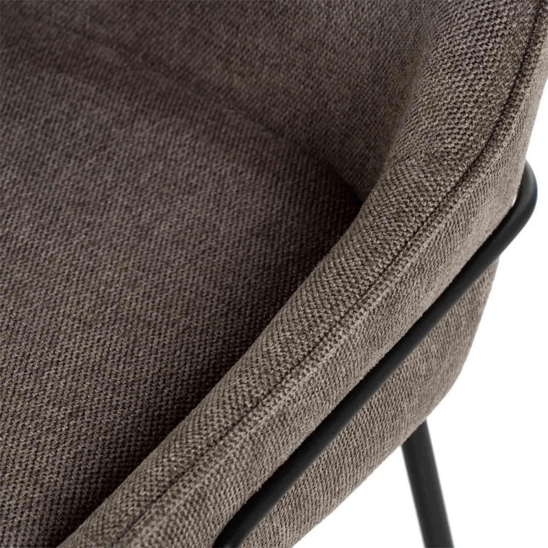 El asiento está tapizado en tela de color taupe (100% poliéster), proporcionando un tono neutro y sofisticado. La estructura y las patas de metal añaden un toque moderno y resistente.