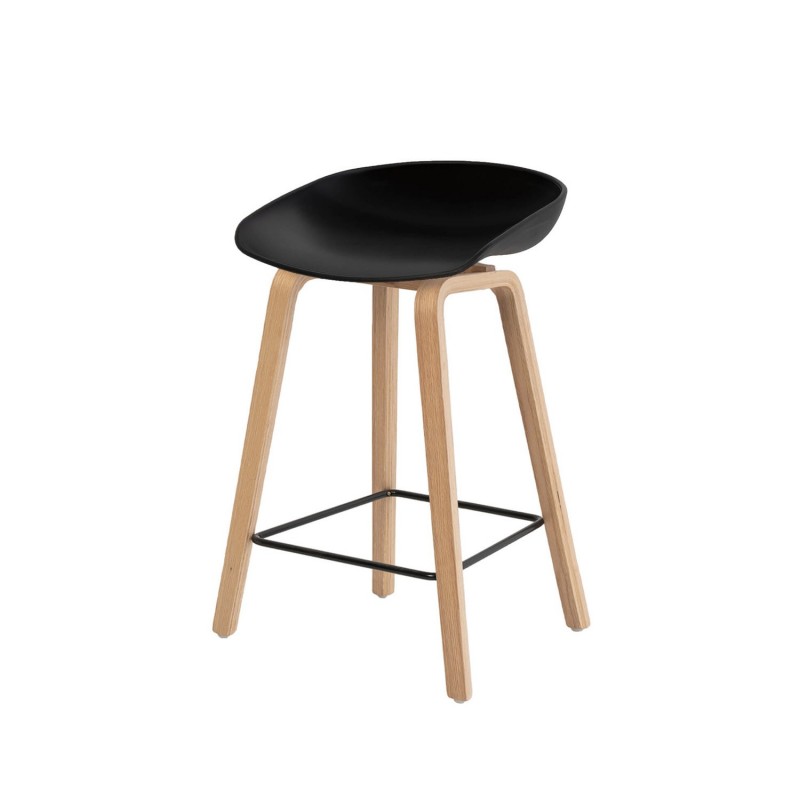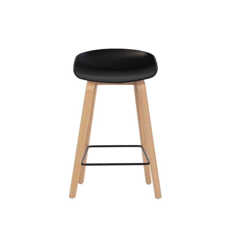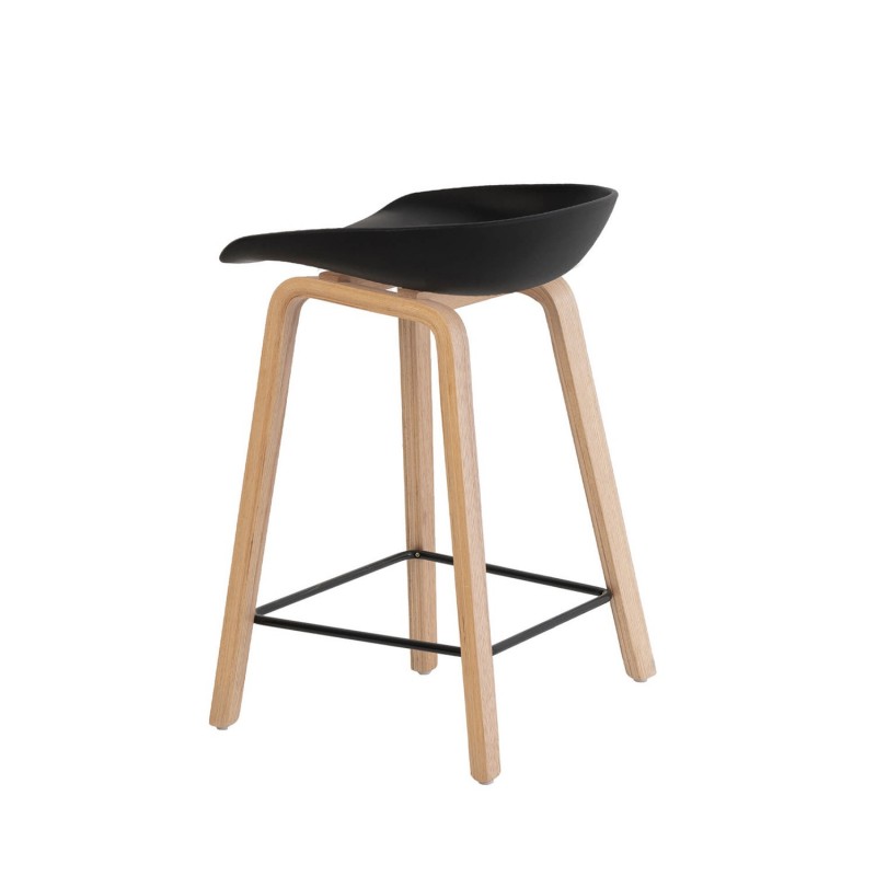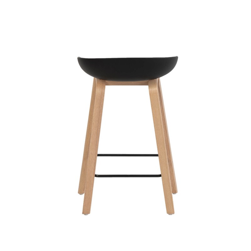 El taburete bajo RUTH destaca por su diseño sencillo pero moderno. Está compuesto por una única pieza de polipropileno duradero en color negro, ligeramente cóncava, que forma tanto el asiento como el respaldo.El contraste con las patas de madera en forma de ‘U’ invertida y el reposapiés metálico en negro le confiere un toque elegante, además de proporcionar un soporte robusto y estable.