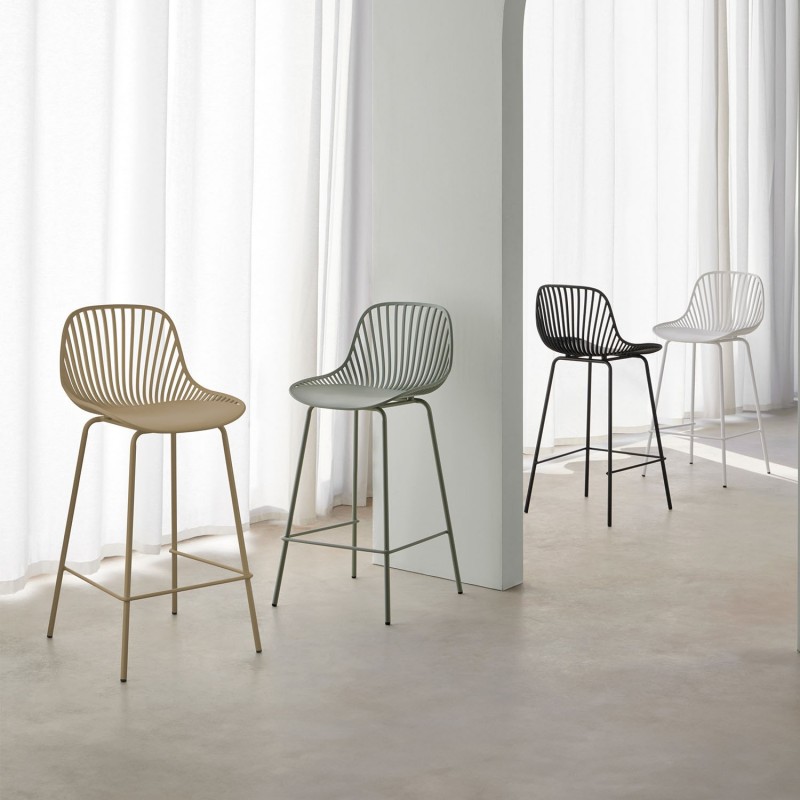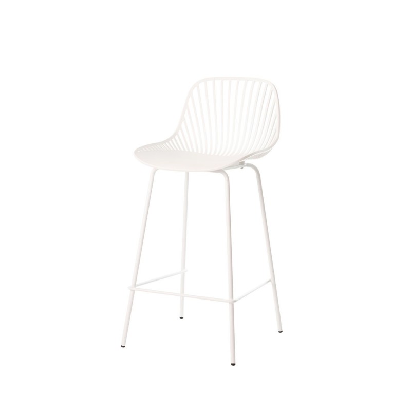 < p >El taburete bajo PEYTON blanco es una pieza de mobiliario única que se destaca por su diseño original y elegante. Con un respaldo abierto compuesto por pequeñas barras verticales y un asiento de polipropileno en color blanco, este taburete ofrece un toque de sofisticación a cualquier espacio.< p >Las patas de metal lacado en mate no solo le dan un aspecto moderno al taburete, sino que también proporcionan una base sólida y estable. Además, el reposapiés integrado añade un nivel adicional de comodidad, permitiéndote disfrutar de largas conversaciones o momentos de relax sin preocupaciones.< p >Ya sea en una cocina, un bar o una sala de estar, el taburete bajo PEYTON se adapta perfectamente a cualquier ambiente gracias a su estilo versátil y contemporáneo. Aporta un toque de frescura y elegancia a tu hogar con este taburete que combina funcionalidad y diseño de forma excepcional.